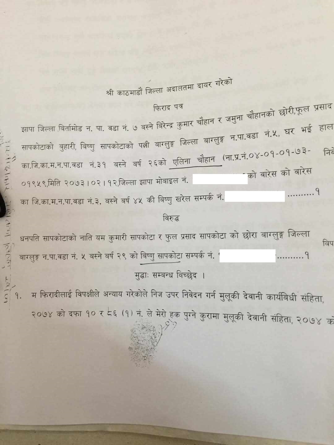 ‘म फिरादी र विपक्षी पतिबीच भावनात्मक रुपमा सुमधुर सम्बन्ध कहिल्यै हुन नसकी कागजी रुपमा मात्र रहेको पति-पत्नीको सम्बन्धमा रहनु भन्दा,’ चौहानले मुद्दामा लेखेकी छिन्, ‘सम्बन्धविच्छेद गरी स्वतन्त्र भई आ-आफ्नो जीवन बिताउन श्रेयस्कर लागेकाले अदालतमा उपस्थित भएकी छु।’