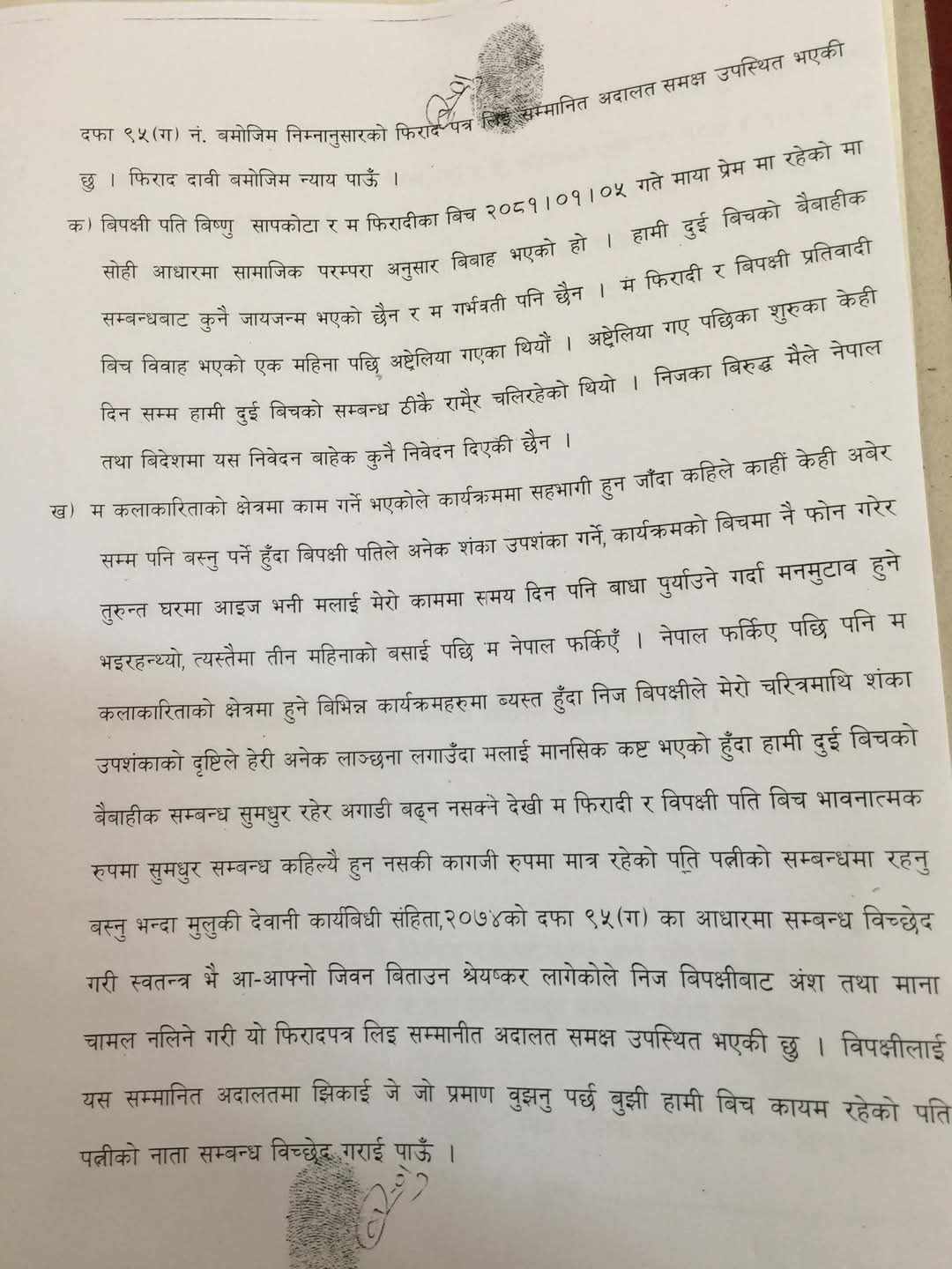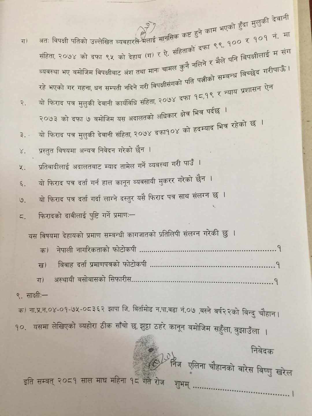 उनले वारेस काठमाडौं महानगरपालिका-३ की ४५ वर्षीया विष्णु खरेललाई वारेस राखेर सम्बन्धविच्छेदको मुद्दा दायर गरेको काठमाडौं जिल्ला अदालतले जनाएको छ।
